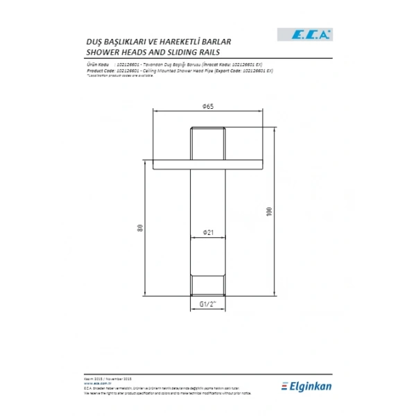 Eca Duş Başlığı Borusu Tavandan Yuvarlak 80 Mm